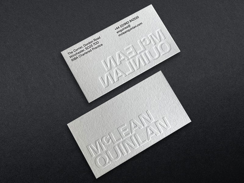Clear foil debossed business cards printed on dark grey 540gsm colorplan stock.
