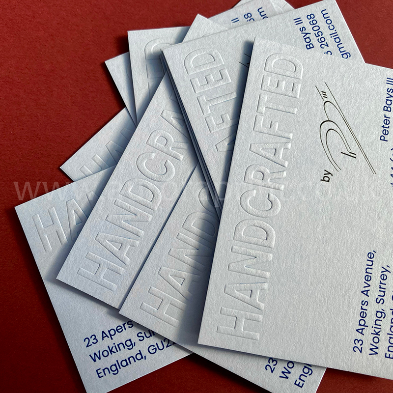 Blind embossed and colour printed business cards, printed on 350gsm Azure Blue Colorplan card.