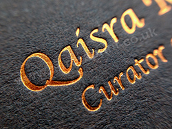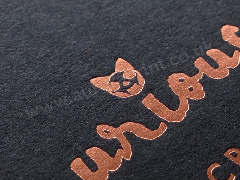 Business cards printed with bright copper foil on bitter chocolate colorplan card.