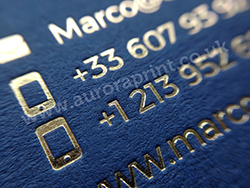 Business cards printed with light metallic gold foil on cobalt blue colorplan.