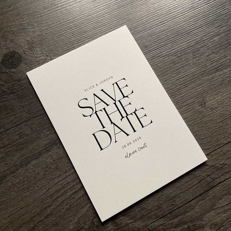 Metallic black foil printed wedding stationery using pristine white colorplan card.