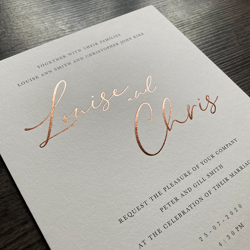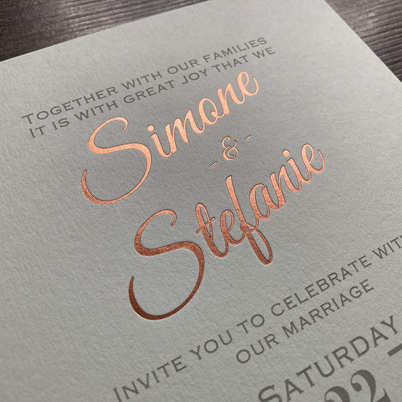 The most commonly used foil colours for wedding invitations are gold, rose gold and silver, but there are many other foil colours that can be used, including; white, satin silver, copper, iridescent silver, red, pink and many more foil colours.