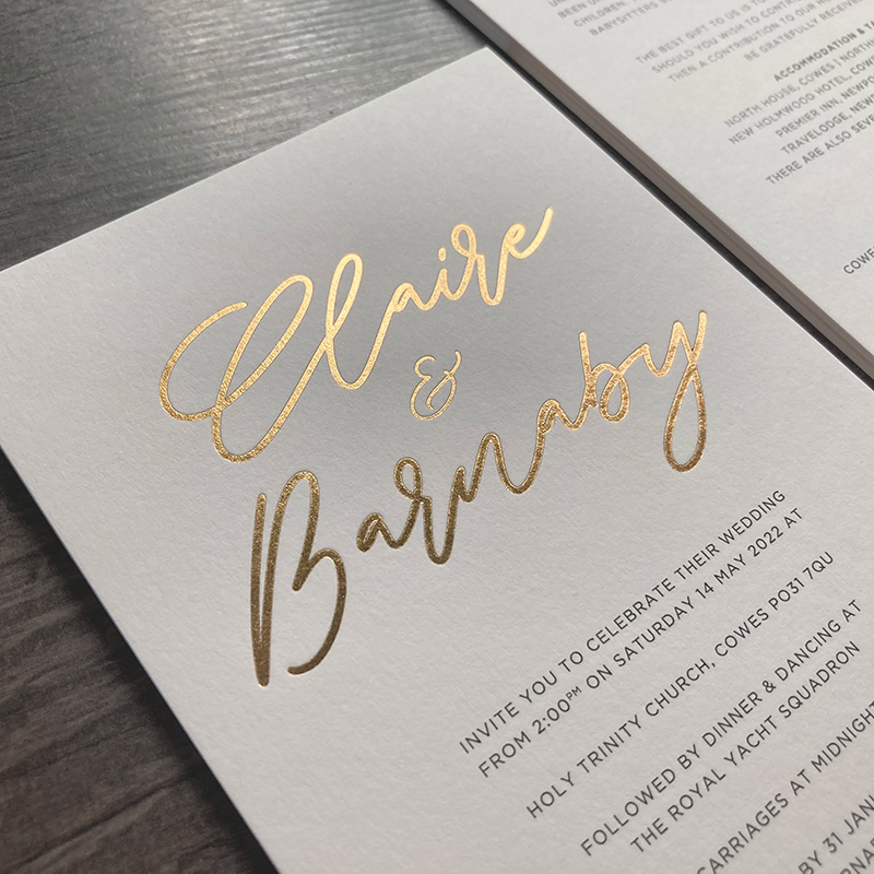Satin (Matt) gold foil printed wedding invitations, printed on natural 540gsm colorplan stock.