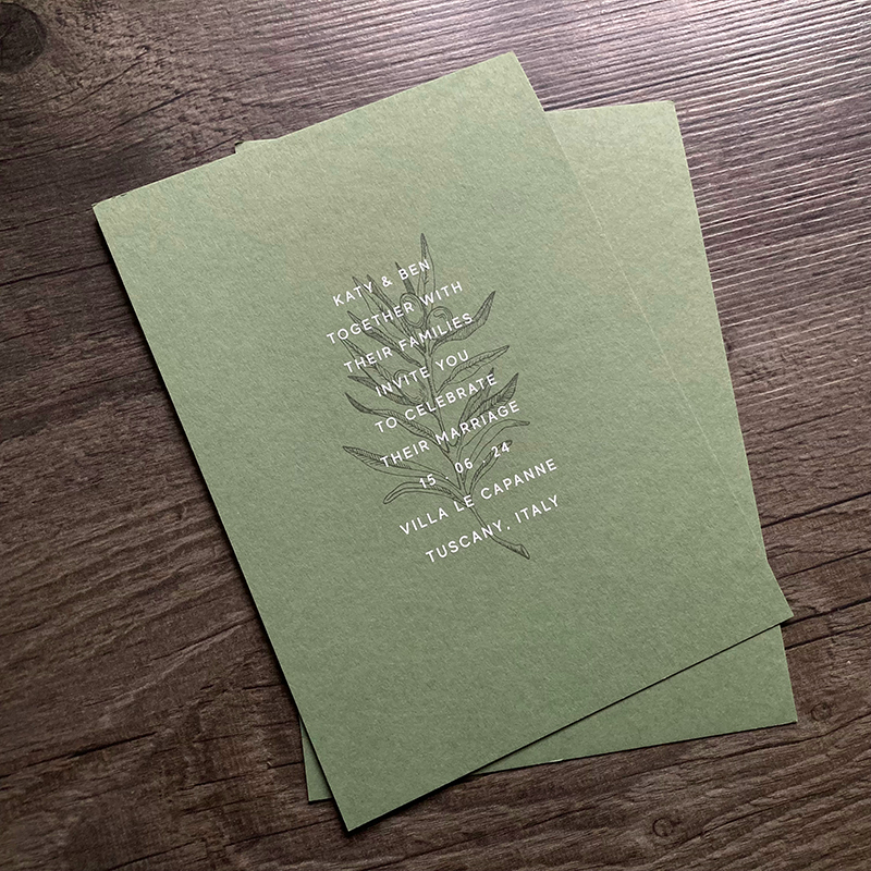 Mid green uncoated card, printed with colour print and white digital print.