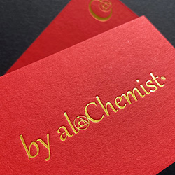 540gsm bright red colorplan business cards, hot foil stamped with a bright yellow-gold foil, printed for 'By al Chemist' launching soon.