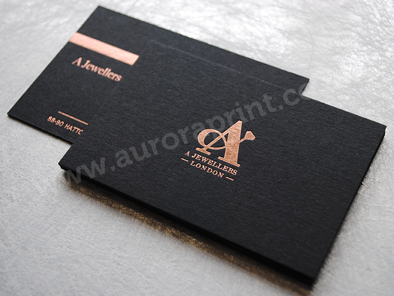 Rose gold foil printed business cards on 540gsm ebony/black colorplan stock.